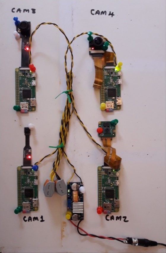 The setup for the cameras consists of 4 Raspberry Pi Zero W with a Sandisk Ultra 16GB class 10. Each Raspberry Pi Zero W board is connected to a camera.