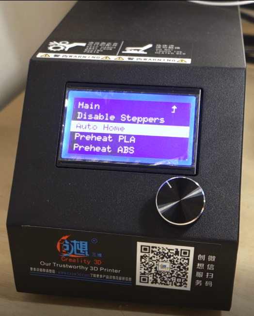 Before you start printing, you need to level the bed. I’ve added painter’s tape to the base, turned on the 3D printer, selected Auto Home and disabled the stepper motors.