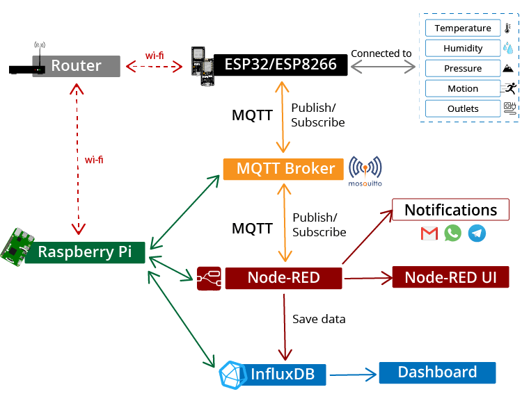 - The brain of the operation is the Raspberry Pi. The Raspberry Pi hosts Node‑RED software, the MQTT broker, and InfluxDB. If you don’t have a Raspberry Pi, you can run the software on the cloud (Digital Ocean);