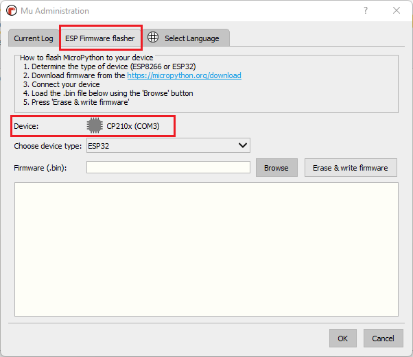 In this section, you’ll learn how to flash MicroPython firmware on your boards using Mu Editor. Follow the next steps: