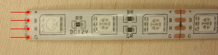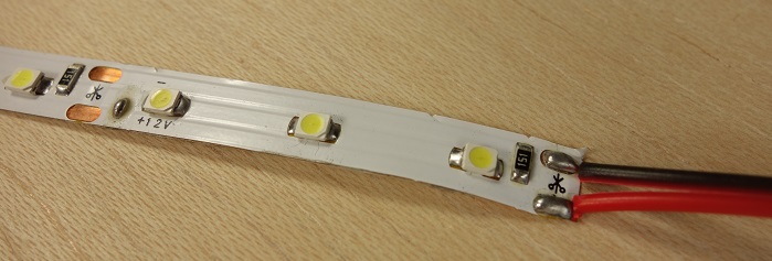 Monocolor LED strips only produce one color. These strips are really easy to wire, they just have two terminals: GND and VCC as shown in the strip below.