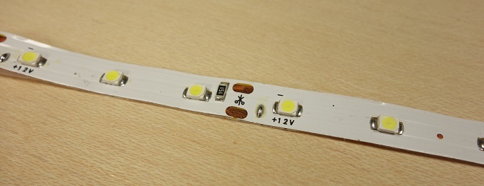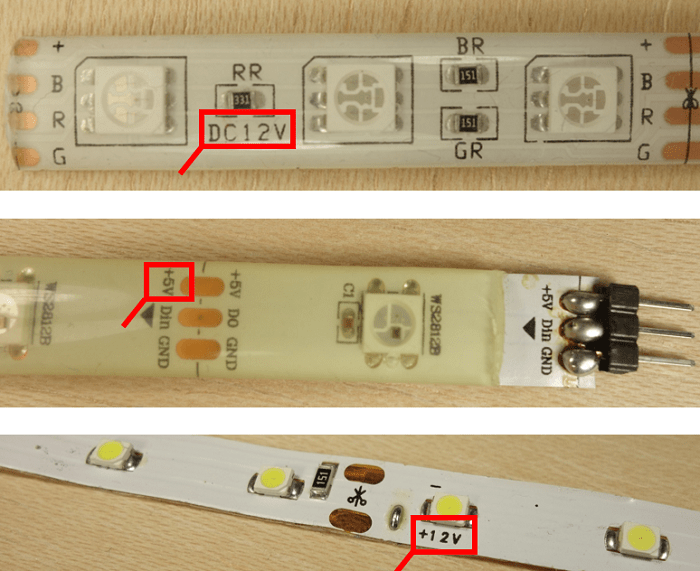 - Power supply: Most LEDs strips are commonly powered with a 5V, or 12V or 24V power supply. The current needed will depend on how long is your LED strip and on the LED density. The voltage supply is usually marked on the strip, as you can see in the figure below. If not, make sure you check the strip’s datasheet to find out.