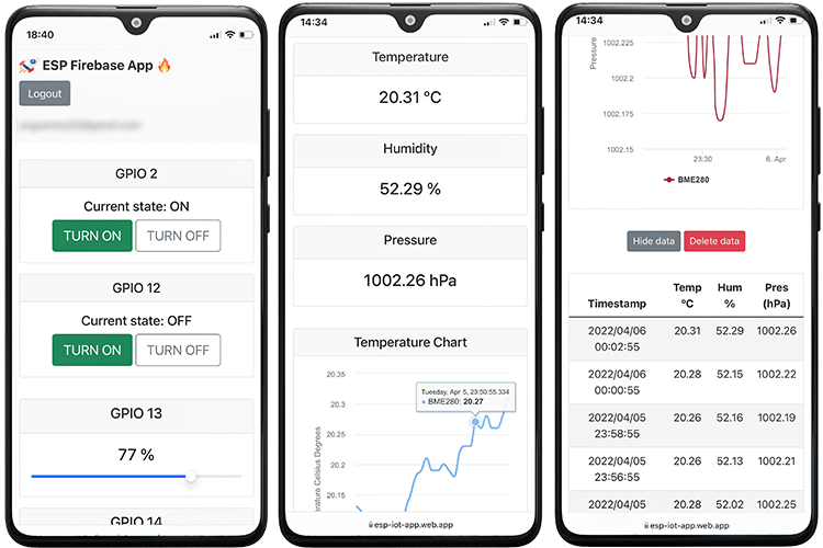 - (NEW) Part 6: ESP32/ESP8266 Datalogging to the Realtime Database—you’ll take your project further by adding a datalogging feature. You’ll learn how to log data with timestamps to have a record of your data history. You’ll display the data on the web app on charts and a table.