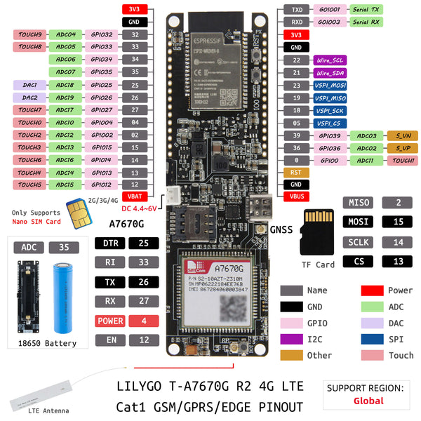 LILYGO TTGO T-A7670G ESP32 Pinout