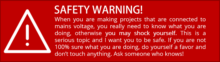 This project deals with mains voltage. Make sure you understand what you are doing. Please read the safety warning below carefully.