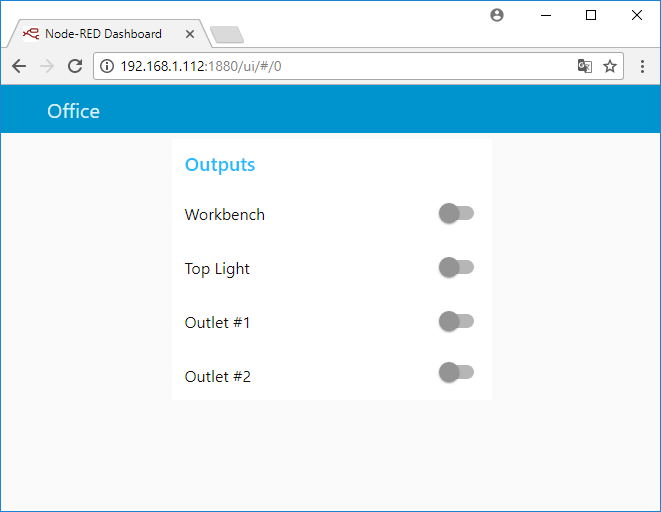 3)Â The Outlet #1 button on the Node-RED is subscribed to this topic, and will receive that message. When it receives that message, it changes the corresponding button state to ON. When this happens, the Node-RED publishes a message on the topic office/outlet1.