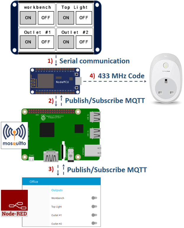 Each Node-RED button publishes on a topic that the ESP8266 #1 and ESP8266 #2 are subscribed to, so that they know when to change the outputs state.