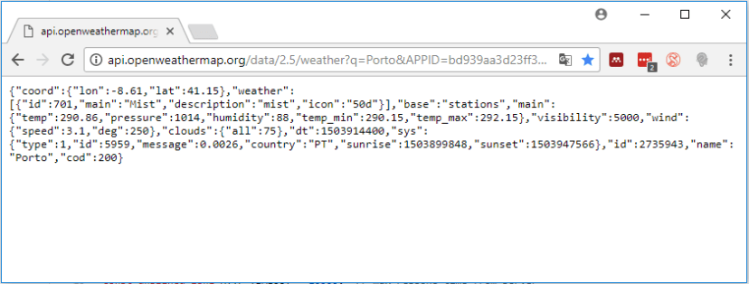 { "coord":{ "lon":-8.61, "lat":41.15 }, "weather":[ { "id":803, "main":"Clouds", "description":"broken clouds", "icon":"04d" } ], "base":"stations", "main":{ "temp":288.15, "pressure":1020, "humidity":93, "temp_min":288.15, "temp_max":288.15 }, (...) }