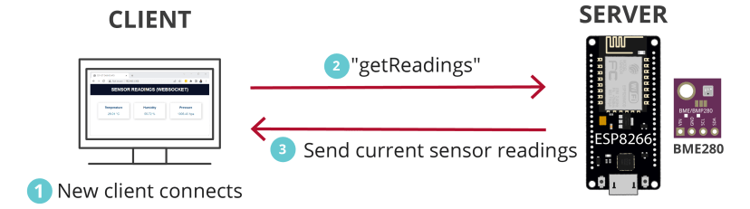 - When you open the webpage, it sends a message (getReadings) to the ESP via WebSocket protocol. The server (ESP) receives that message. When that happens, it gets new readings from the sensors and sends them back to the client (web browser), also via web socket protocol. This way, whenever you open a new tab, it always shows the current and updated values.