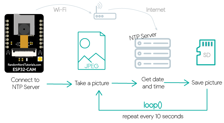 it was taken (it’s a unique filename); - Repeat steps 4 to 6 every 10 seconds. For demonstration purposes, the ESP32-CAM will do this task over and over again on the loop(). The idea is to apply the concepts you’ll learn with this example to your own projects.
