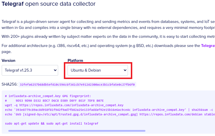Scroll down to the Telegraf section. Select the platform Ubuntu & Debian. Then, copy the commands provided.