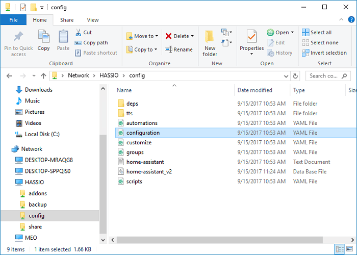 1) Once Samba share is installed, in your computer, go to Network Devices. You should see a new device called HASSIO. Open it and there should be a couple of folders, including the config folder.