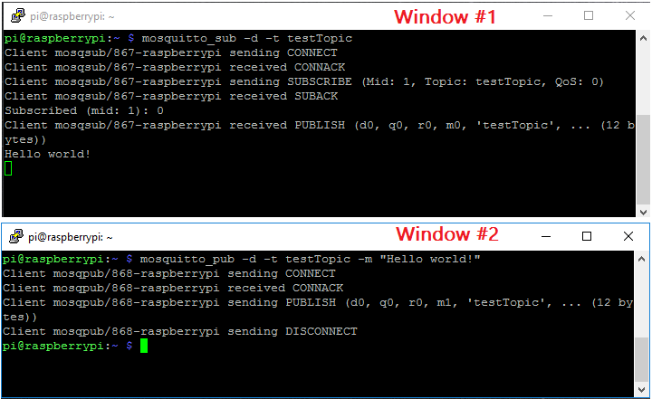 To subscribe to an MQTT topic with Mosquitto Client open a terminal Window #1 and enter the command: