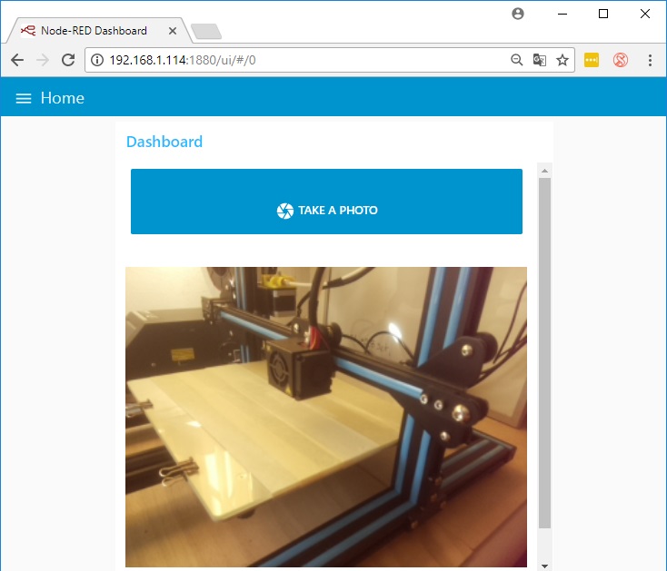 The next figure shows how the Node-RED UI looks. We’re using this application to monitor our Creality CR-10 3D printer. With this setup we can quickly check the printing status from any room by clicking the TAKE A PHOTO button.