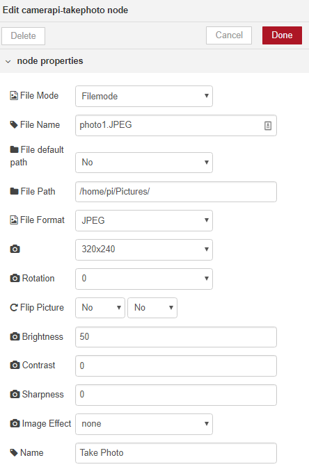 2. In Node-RED open the “camerapi takephoto” node and ensure that it has the right file path for the photo. Donât forget to add the right File Path to your node including the last forward slash, for example: /home/pi/Pictures/