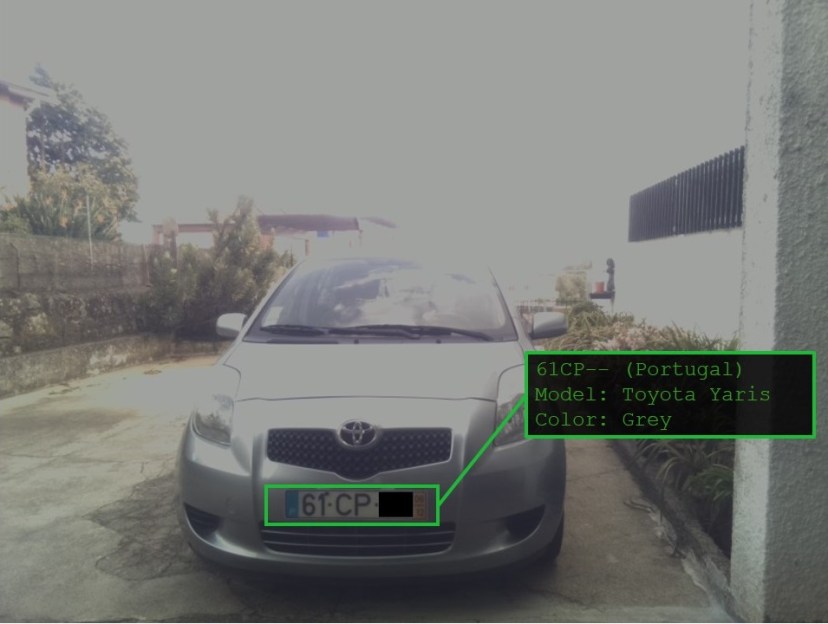 OpenALPR is an open source Automatic License Plate Recognition library written in C++ with bindings in C#, Java, Node.js, Go, and Python. They also have the OpenALPR Cloud API which is a web service running in the cloud that analyzes images of vehicles and responds with license plate, model, color and much more. OpenALPR Cloud API has a free service that allows up to 2000 free recognitions per month.