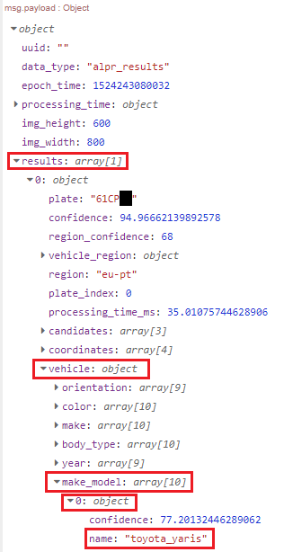 Open the debug window, and you should see an object with all the details about the JSON response. The results array should have at least one result (array[1]), otherwise it might be analyzing a photo without a car or it couldn’t identify the car (make sure the Pi Camera is pointed to the car while you take the photo).