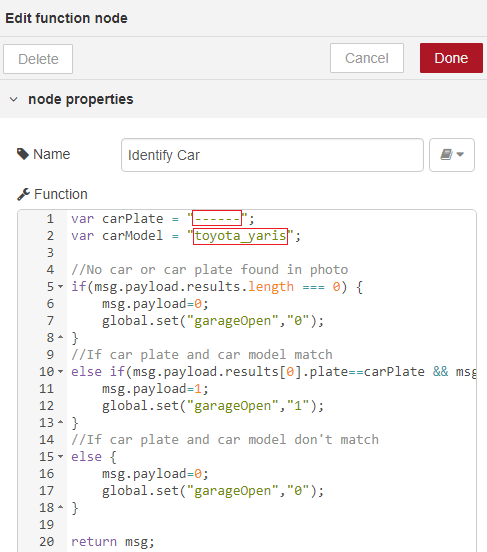 Note: if you want to add another car plate, you need to edit the “Identify Car” function. Declare another carPlate2 and carModel2: