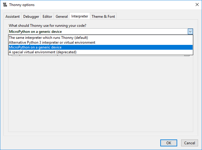 1. Go to Tools > Options and select the Interpreter tab. Make sure you’ve selected the right interpreter for your board as well as the COM port.