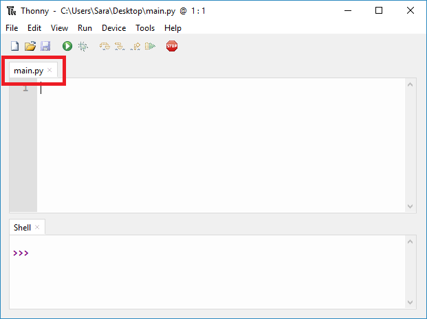 1. When you open Thonny IDE for the first time, the Editor shows an untitled file. Save that file as main.py by clicking on the save icon. Select the “This computer” option. We recommend saving the file inside a folder with a name that identifies the project, for example Blink. The file must be called main.py. Otherwise, it will not work.