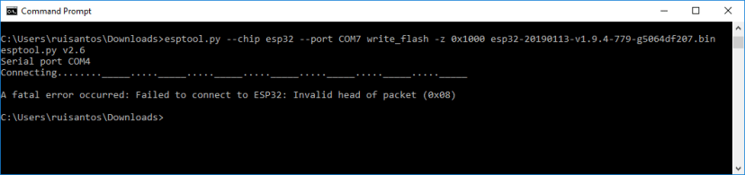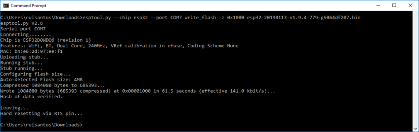 python -m esptool --chip esp32 --port COM7 write_flash -z 0x1000 esp32-20190113-v1.9.4-779-g5064df207.bin