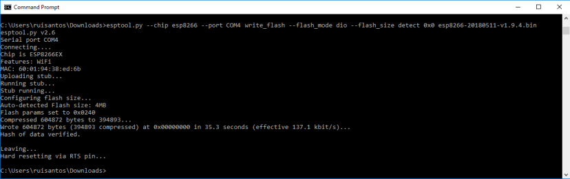 python -m esptool --chip esp8266 --port COM4 write_flash --flash_mode dio --flash_size detect 0x0 esp8266-20180511-v1.9.4.bin