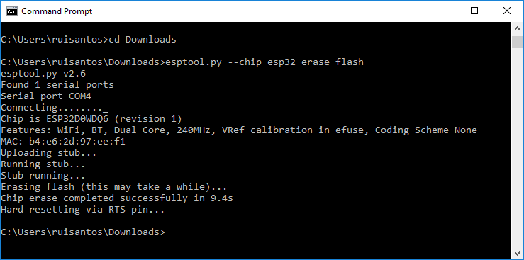 Note: with some Python installations that command may not work and you’ll receive an error. If that’s the case, try to install esptool.py with: