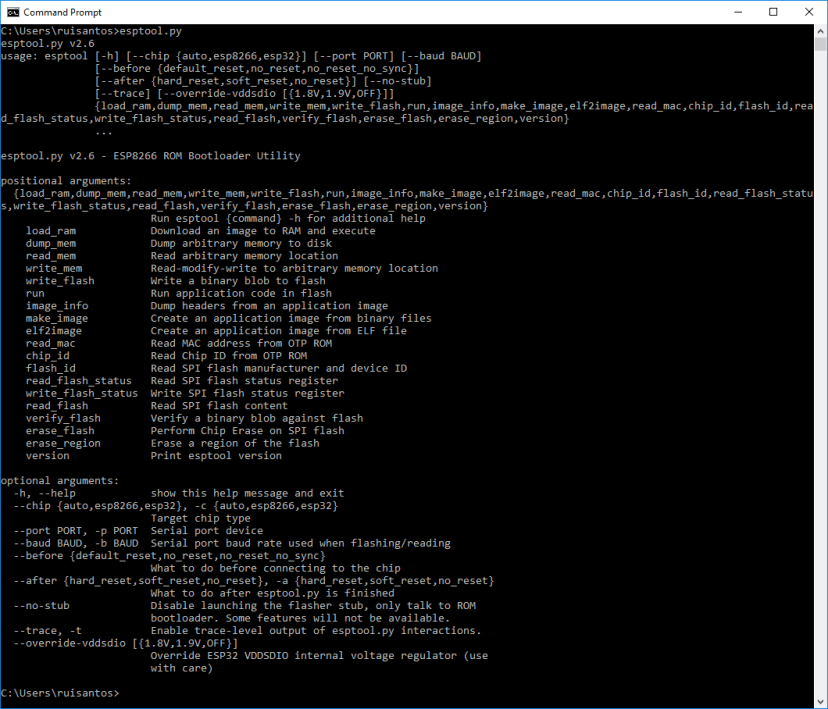 After installing, you will have esptool.py installed into the default Python executables directory and you should be able to run it with the command esptool.py. In your Terminal window, run the following command: