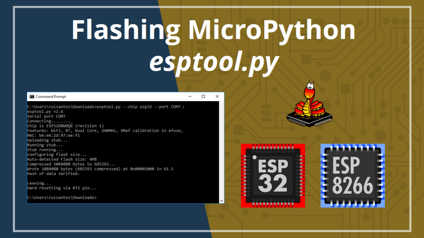 With esptool.py installed on your computer, you can easily flash your ESP32 or ESP8266 boards with the MicroPython firmware. This post is divided into two parts, read Part 1 or Part 2 depending on your board: