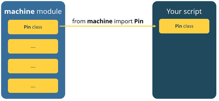 In most programs you won’t need all the classes from one module. You may just want to import a single class. For example, to import only the Pin class from the machine module: