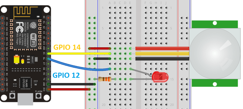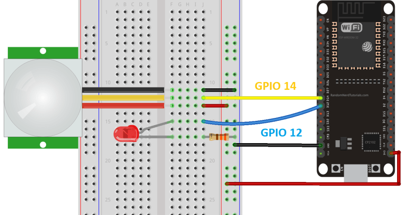 Important: the Mini AM312 PIR Motion Sensor we’re using in this project operates at 3.3V. However, if you’re using another PIR motion sensor like the HC-SR501, it operates at 5V. You can either modify it to operate at 3.3V or simply power it using the Vin pin.