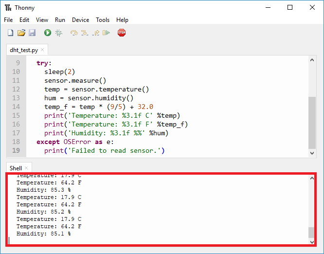 New temperature and humidity readings should be displayed on the MicroPython Shell, every two seconds.