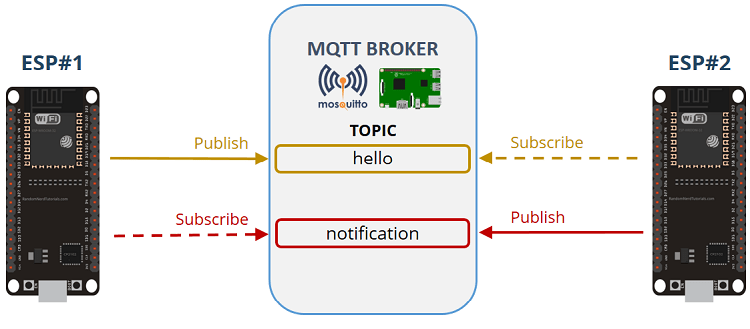 - ESP#1 publishes messages on the hello topic. It publishes a “Hello” message followed by a counter (Hello 1, Hello 2, Hello 3, …). It publishes a new message every 5 seconds.