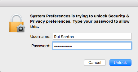 3. At the bottom left corner, click the lock icon to modify your “Security & Privacy” settings: