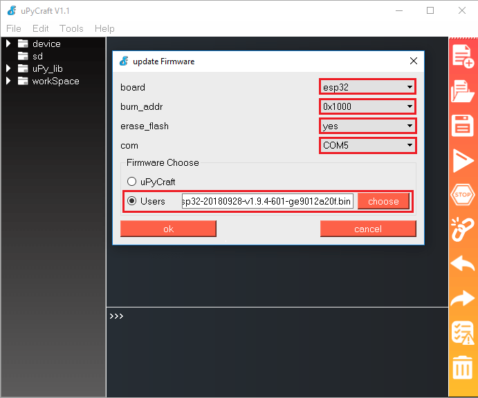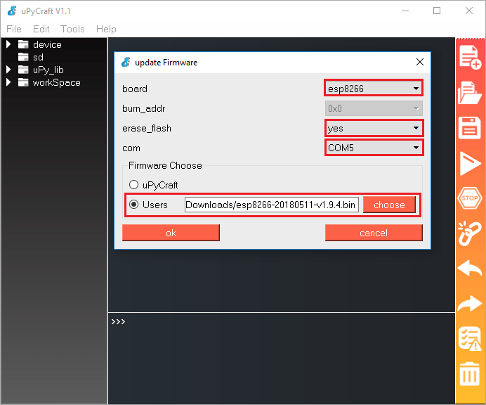 I flashed my esp-01 with firmware for 512k, and flash goes ok, but after restart I try to set uPyCraft to COM Port and then comes Burn Firmware Window – the app doesn’t recognise my device. What’s wrong with it?