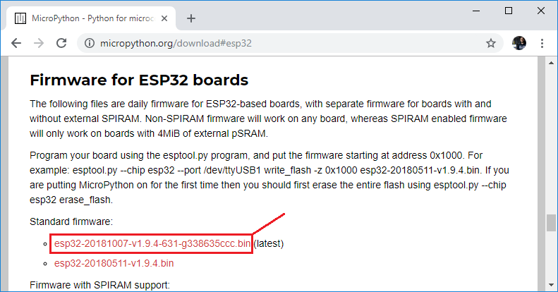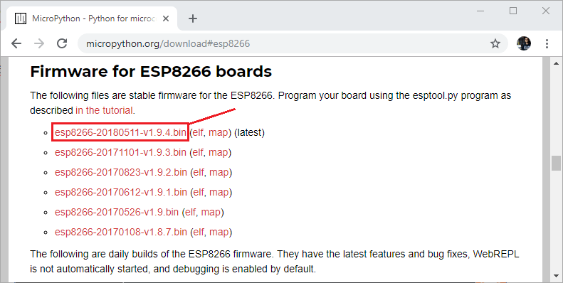 You should see a similar web page (see figure below) with the latest link to download the ESP8266 .bin file – for example: esp8266-20180511-v1.9.4.bin.