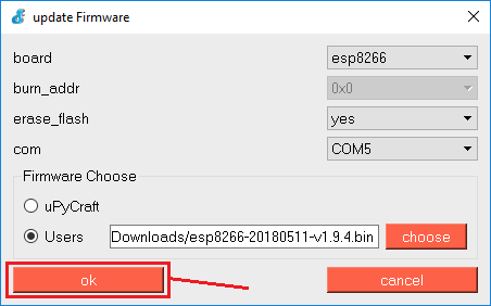 - Firmware: Select “Users” and choose the ESP8266 .bin file downloaded earlier