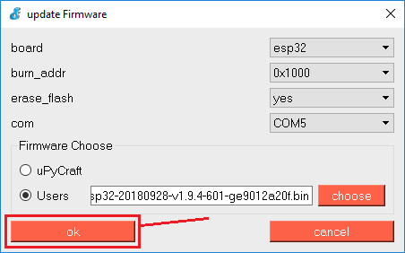 - Firmware: Select “Users” and choose the ESP32 .bin file downloaded earlier