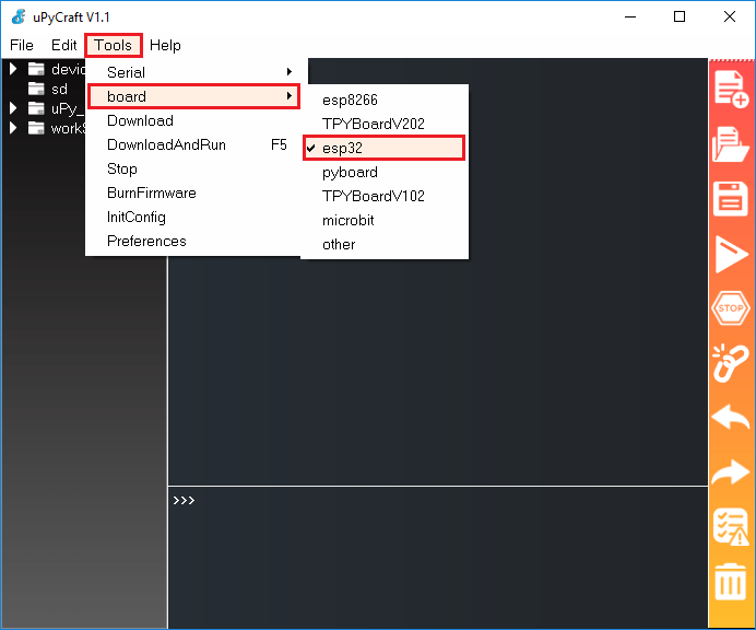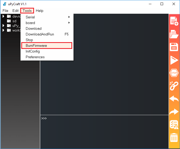 Finally, go to Tools > BurnFirmware menu to flash your ESP32 with MicroPython.