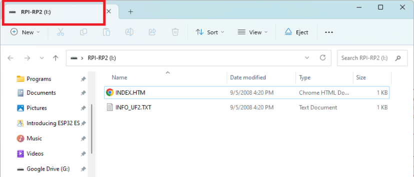 Drag and drop the MicroPython file you downloaded previously onto the RPI-RP2 device. The window will automatically close and your device will be running MicroPython.
