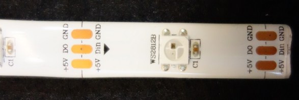 In the following figure you can see my WS2812B LED strip. It is 5 meters long and the LEDs are enclosed in a weatherproof silicone. So, they can be left outside at the rain and dust without any problem.
