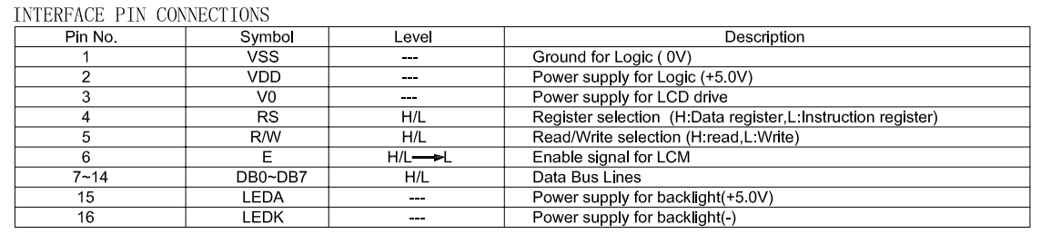 The next table shows a brief description of each pin of the LCD display. Make sure your LCD uses the same pinout.