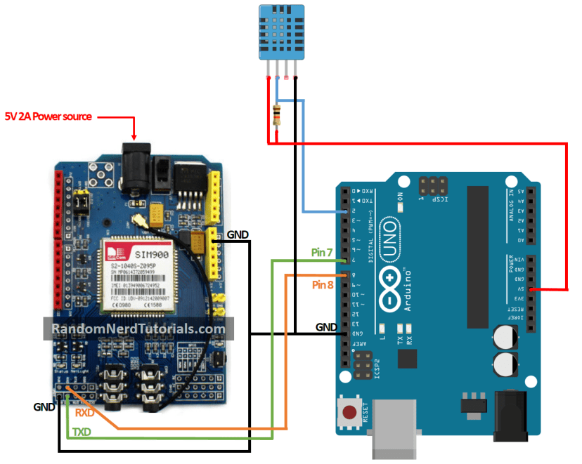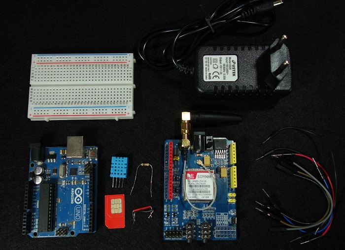 You have to connect the SIM900 GSM shield and the DHT11 temperature and humidity sensor to the Arduino as shown in the figure below.
