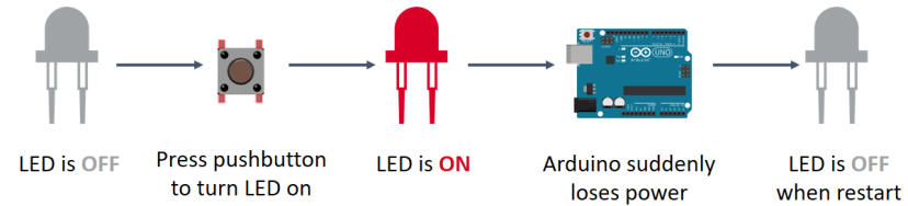 In this example, we’re going to show you how to make the Arduino remember the stored LED state, even when we reset the Arduino or the power goes off.