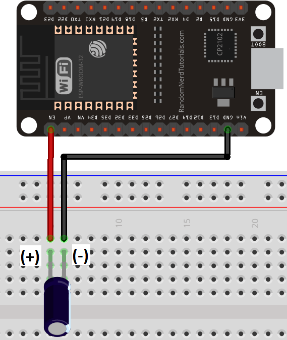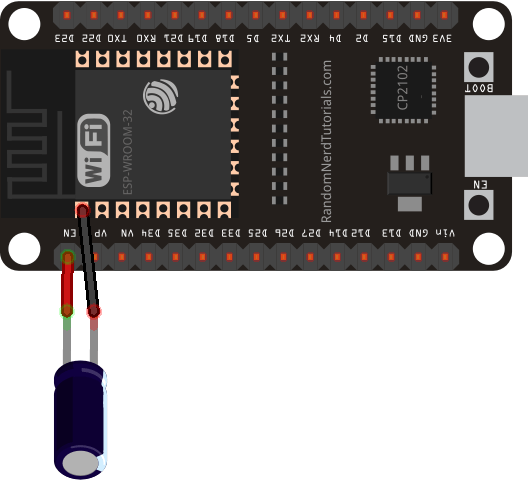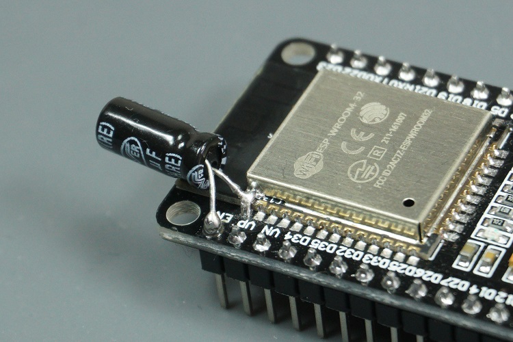 If it works, then you can solder the 10 uF electrolytic capacitor to the board. Since the EN and GND pins are far apart from each other, you can simply connect the capacitor between the EN and the GND of the ESP32 chip as shown in the schematic diagram below:
