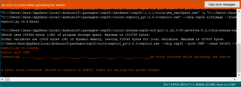 Learn how to fix the Fatal Error Occurred: “Failed to connect to ESP32: Timed out waiting for packet header” error when trying to upload new code to your ESP32 board once for all.