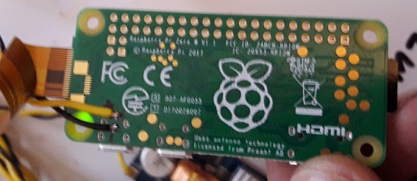 In this setup, the power leads yellow/black are soldered directly to the back of the Raspberry Pi Zero board.