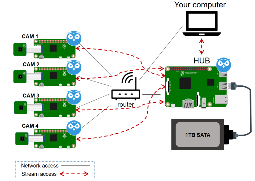 All devices are connected to your local network, and you can access all the cameras through the hub using a browser on your computer (or other device on the local network). The following figure shows a high-level overview of the project.