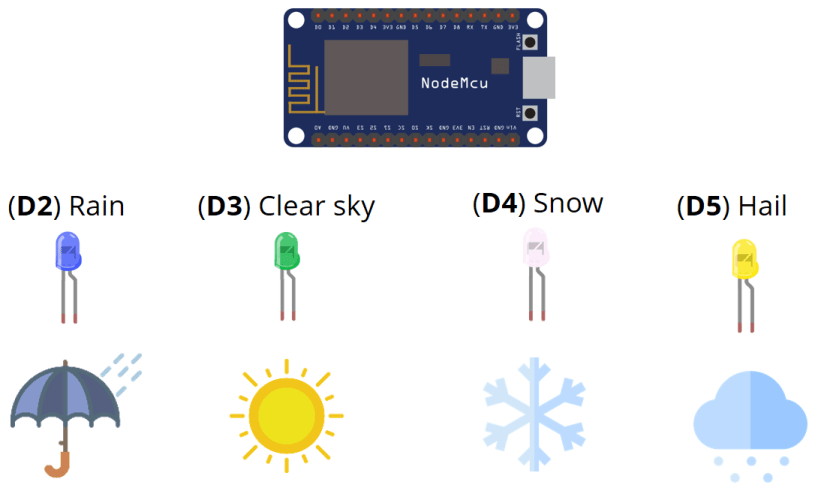 - 4x LEDs (different colors to represent different weather conditions)