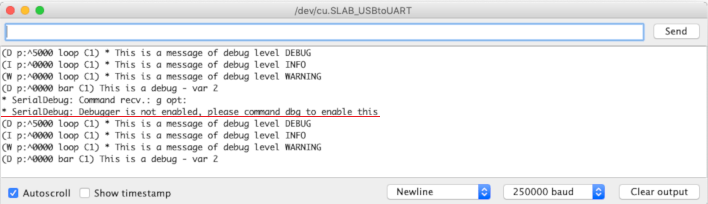 - Software: It’s implemented in software, not in hardware as a real hardware debugger. But it is optimized to reduce memory and overhead of processing. For this reason, this feature in SerialDebug library starts disabled until receiving the command “dbg”.